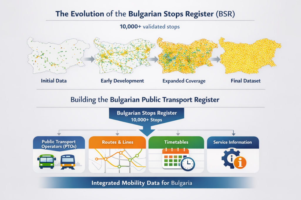 The Bulgarian Stops Register therefore represents an ongoing effort to organise and improve existing transport stop information, creating a foundation that can support future national mobility data infrastructure.