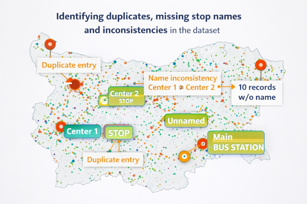 When this work began, information about transport stops in Bulgaria was highly fragmented and inconsistent. Data existed across different sources and formats, often lacking standard identifiers, validation processes, or consistent structure.